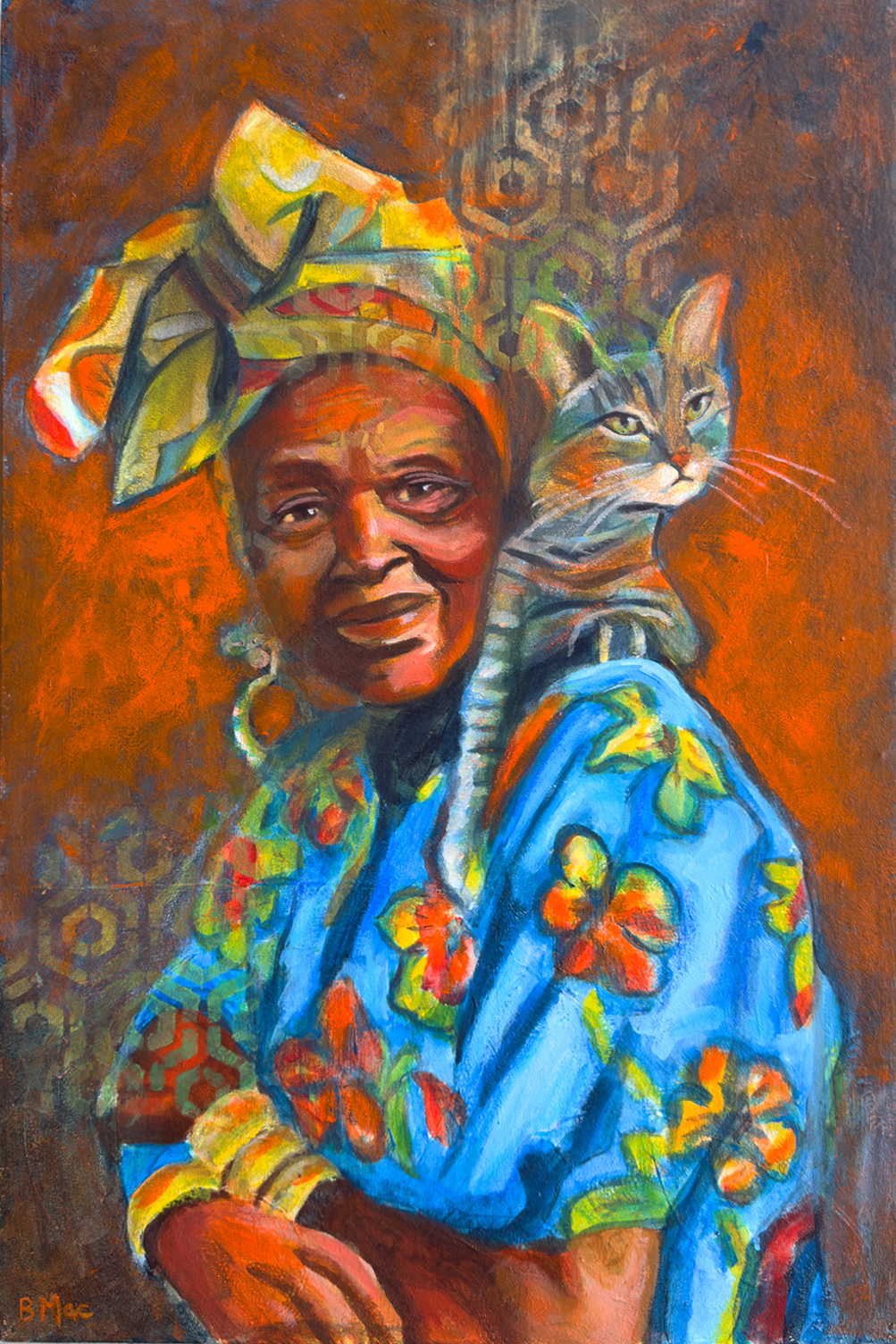 De vrouw straalt rust, wijsheid en trots, terwijl de kat op haar schouder zit als een stille, trouwe metgezel.